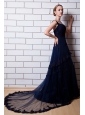 Navy Blue A-line Straps Chapel Train Tulle Appliques Homecoming Dress
