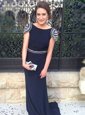 Navy Blue Chiffon Zipper Evening Dress Cap Sleeves Brush Train Beading