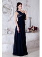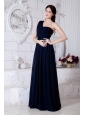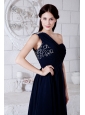 Navy Blue Empire One Shoulder Beading Prom / Evening Dress Brush Train Chiffon