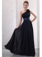 Navy Blue Empire One Shoulder Prom Dress with Beading and Flower