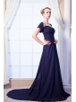 Home >  Prom Dresses >  Modest Prom Dresses > Navy Blue Empire Sweetheart Prom Dress Chiffon Beading Brush Train