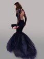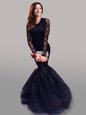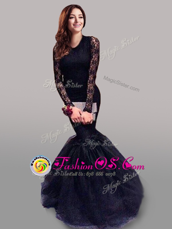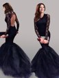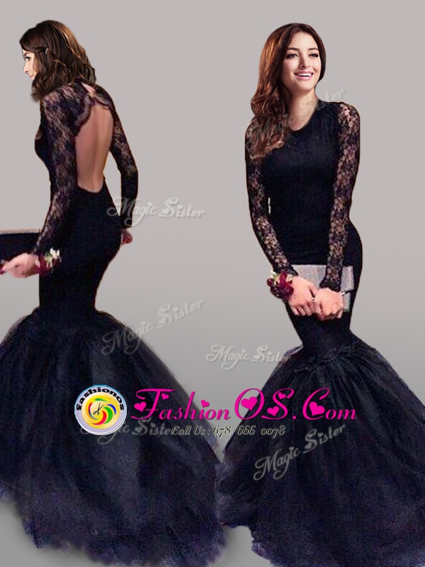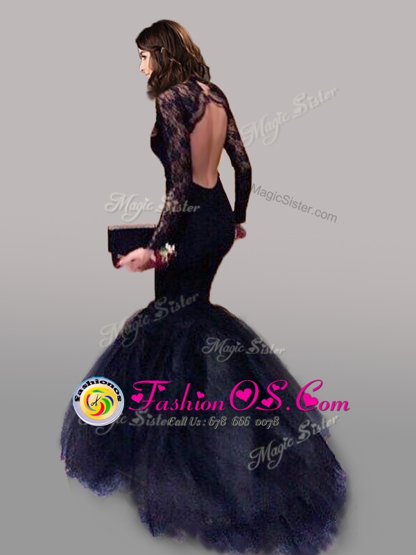 Home >  Prom Dresses >  Perfect Prom Dresses > Navy Blue Mermaid Tulle Scoop Long Sleeves Lace With Train Backless Brush Train