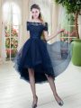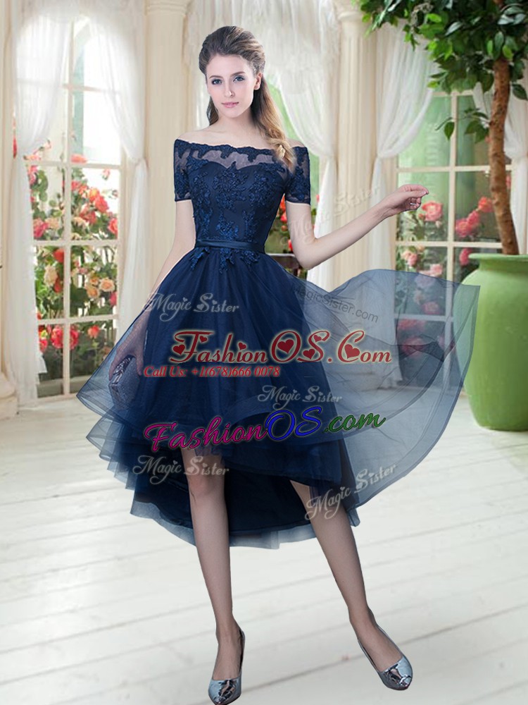 Navy Blue Off The Shoulder Lace Up Lace Prom Dress Short Sleeves