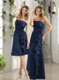 Navy Blue Ruching and Hand Made Flowers Strapless Prom Dresses