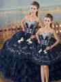 Home >  Quinceanera Dresses >  Detachable Quinceanera Skirts > Navy Blue Three Pieces Organza Sweetheart Sleeveless Embroidery and Ruffles Floor Length Lace Up Quinceanera Gown