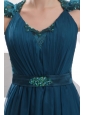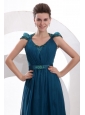 Navy Blue V-neck Cap Sleeves Beaded Decorate Brush Train Prom Dress
