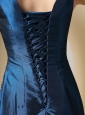 This fabulous prom gown in rich hues of shimmering taffeta has star quality glamour. A straps V-neck neckline on a structured bodice overflowing with asymmetrically ruches. A lovely hand made flower decorate the waistline. Romantic fabric on one side falling down to the floor from the waist area. Lace up back makes for easy off and on and secures the dress in place.