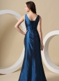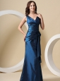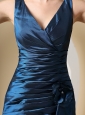 Navy Blue V-neck Ruched Bodice and Hand Made Flowers For Bridesmaid Dress