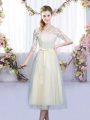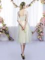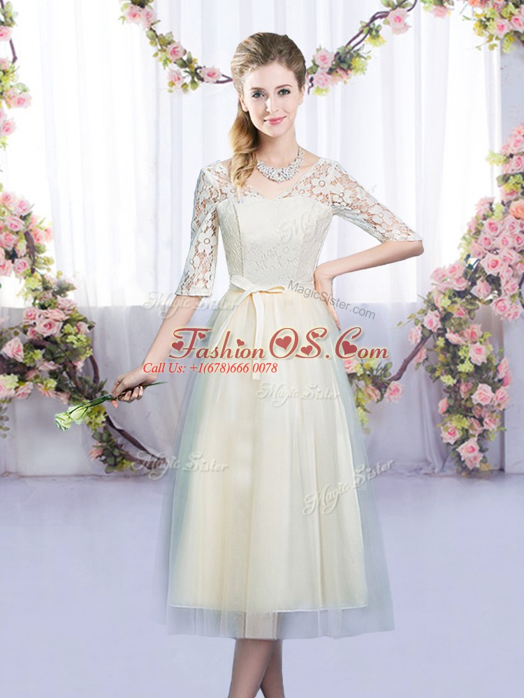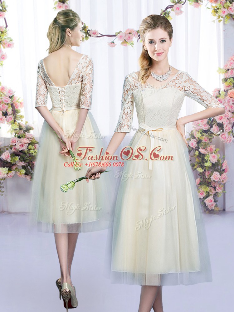 New Arrival Half Sleeves Lace Up Tea Length Lace and Bowknot Dama Dress for Quinceanera