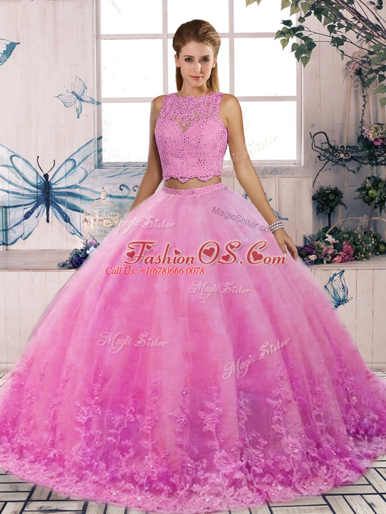Home >  Quinceanera Dresses >  Quinceanera Dresses 2019 > New Arrival Scalloped Sleeveless Sweet 16 Dress Sweep Train Lace Rose Pink Tulle