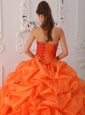 A sweetheart neckline features beadings and embroidery all around the bodice. Accented by a slit in the front and a train in the back with some embroideries at the very bottom. This orange quinceanera dress is fabulous and gorgeous! In the smooth and soft taffeta fabric, you must be shinning during your special occasion.