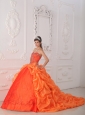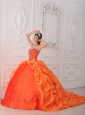 A sweetheart neckline features beadings and embroidery all around the bodice. Accented by a slit in the front and a train in the back with some embroideries at the very bottom. This orange quinceanera dress is fabulous and gorgeous! In the smooth and soft taffeta fabric, you must be shinning during your special occasion.