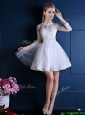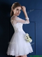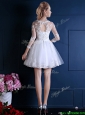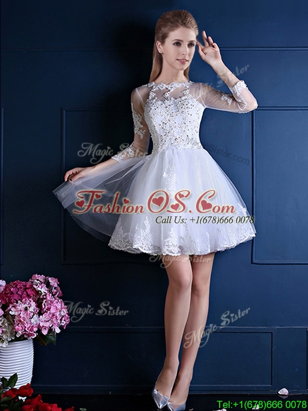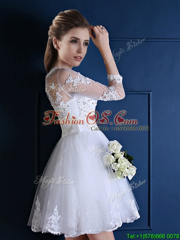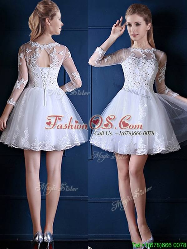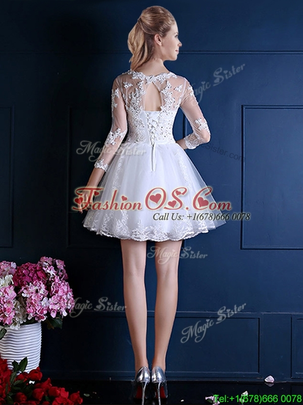 New See Through Scoop Three Fourth Length Sleeves Short Bridesmaid Dress in White