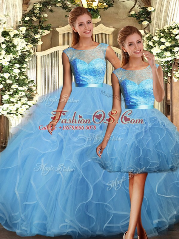 Home >  Quinceanera Dresses >  Detachable Quinceanera Skirts > New Style Baby Blue Three Pieces Lace and Ruffles 15th Birthday Dress Backless Tulle Sleeveless Floor Length