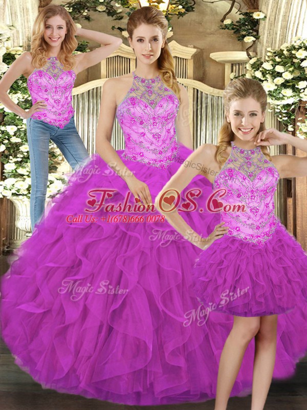 Home >  Quinceanera Dresses >  Detachable Quinceanera Skirts > New Style Floor Length Fuchsia Ball Gown Prom Dress Halter Top Sleeveless Lace Up