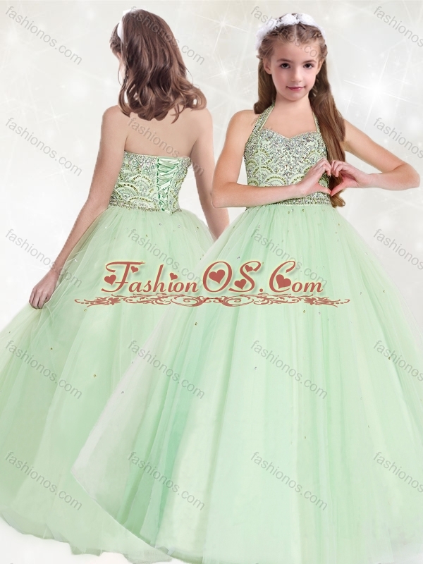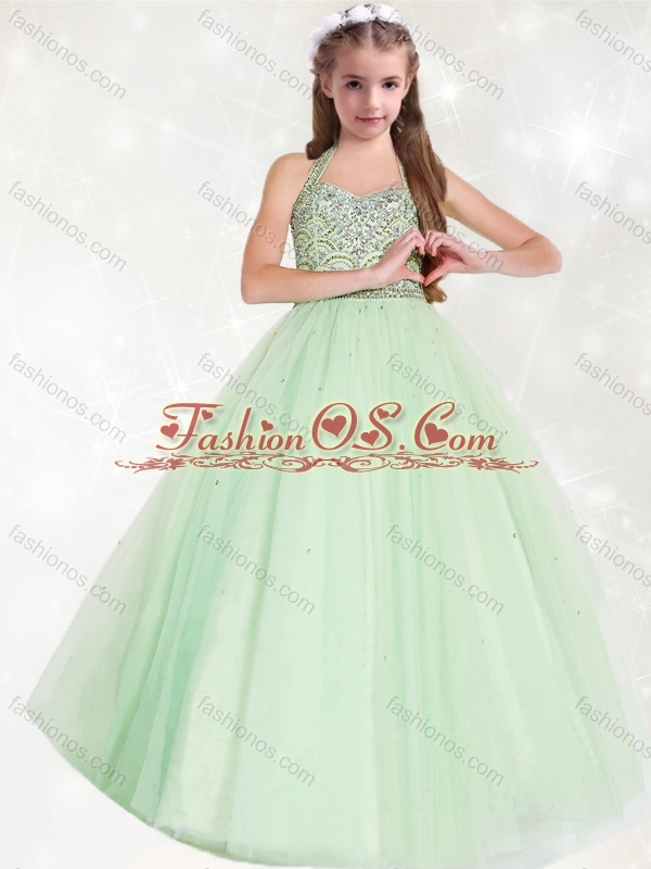 New Style Halter Top Beaded Little Girl Pageant Dress in Apple Green