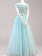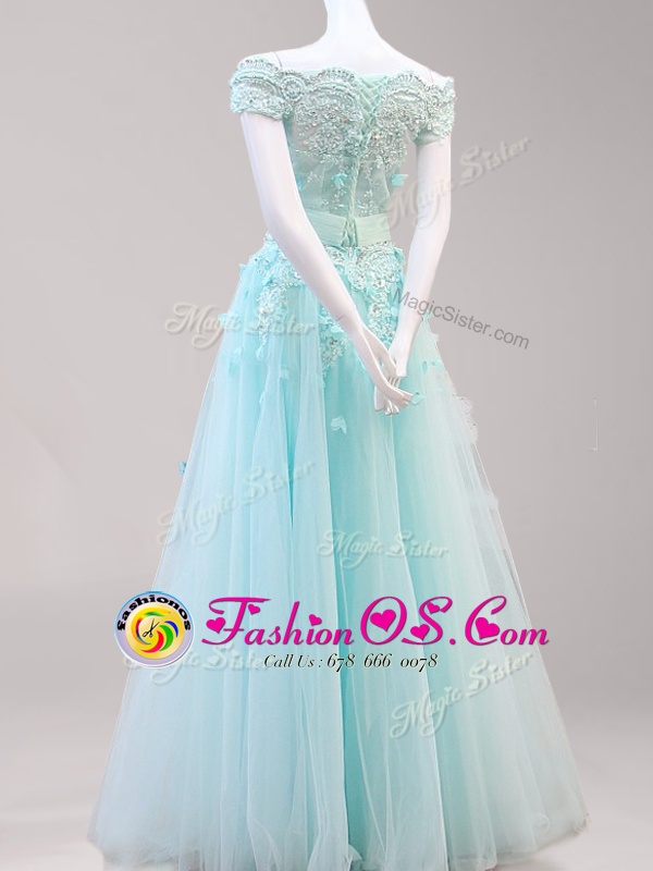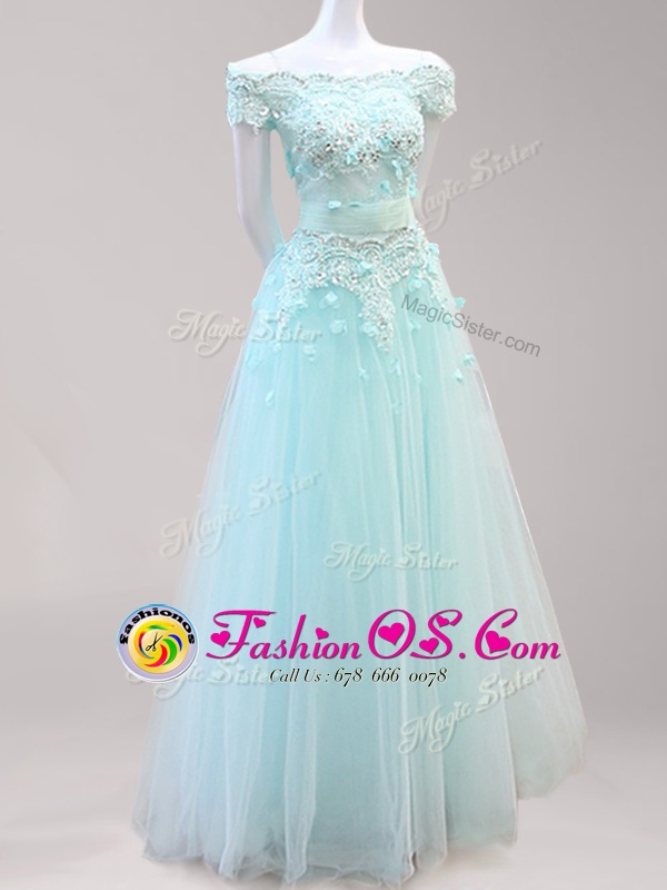 New Style Light Blue Homecoming Gowns Prom and For with Beading and Appliques Off The Shoulder Cap Sleeves Zipper
