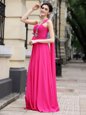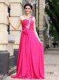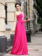 New Style One Shoulder Sleeveless Chiffon With Brush Train Zipper Prom Evening Gown in Hot Pink for with Beading and Sashes|ribbons and Ruching
