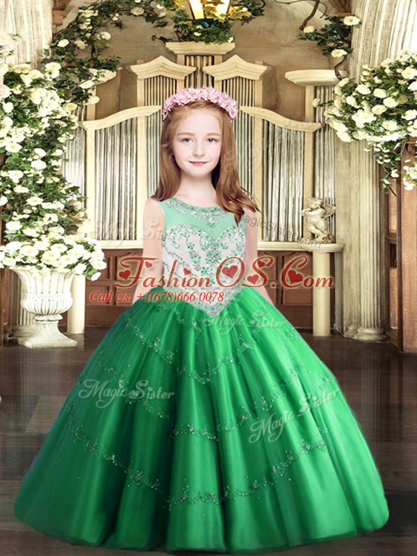 New Style Sleeveless Tulle Floor Length Zipper Pageant Gowns For Girls in Green with Beading and Appliques