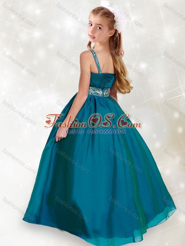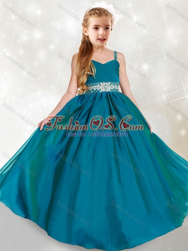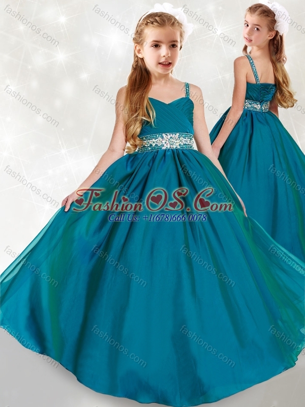 Home >  Special Occasion Dresses >  New Style Little Girl Pageant Dresses > New Style Spaghetti Straps Turquoise Little Girl Pageant Dress with Beading and Ruching