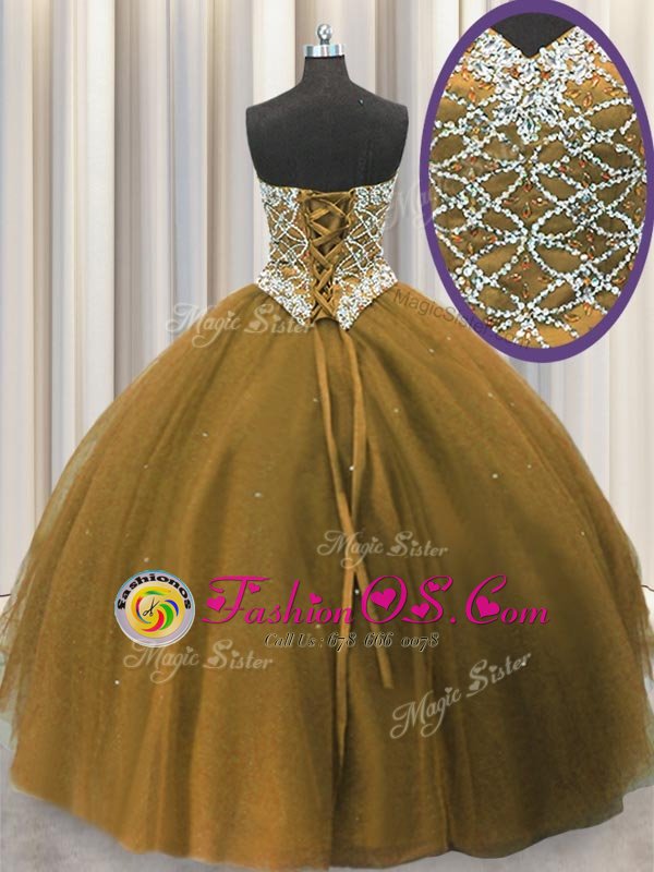 Home >  Quinceanera Dresses >  Detachable Quinceanera Skirts > New Style Three Piece Sequins Brown Sleeveless Tulle Lace Up 15th Birthday Dress for Military Ball and Sweet 16 and Quinceanera
