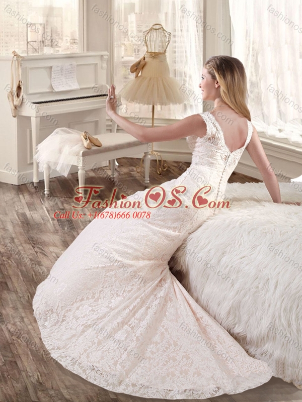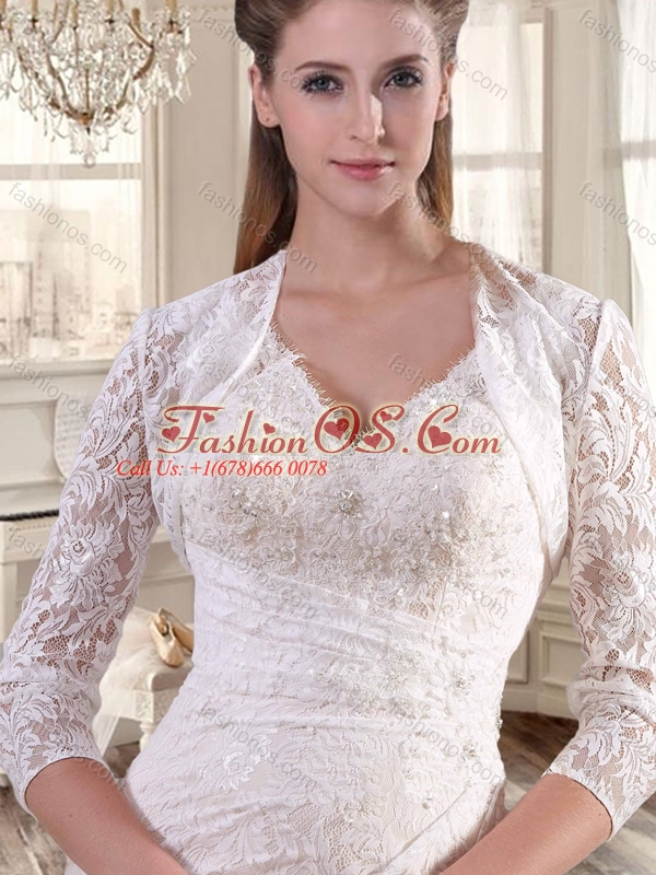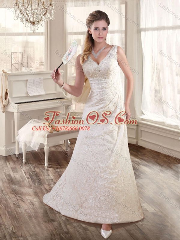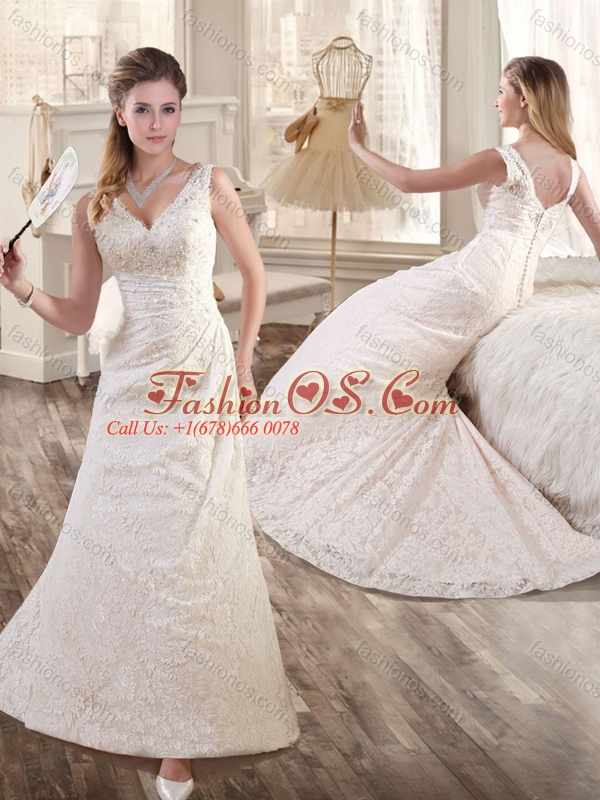 New Style V Neck Brush Train Lace Wedding Dresses for Garden