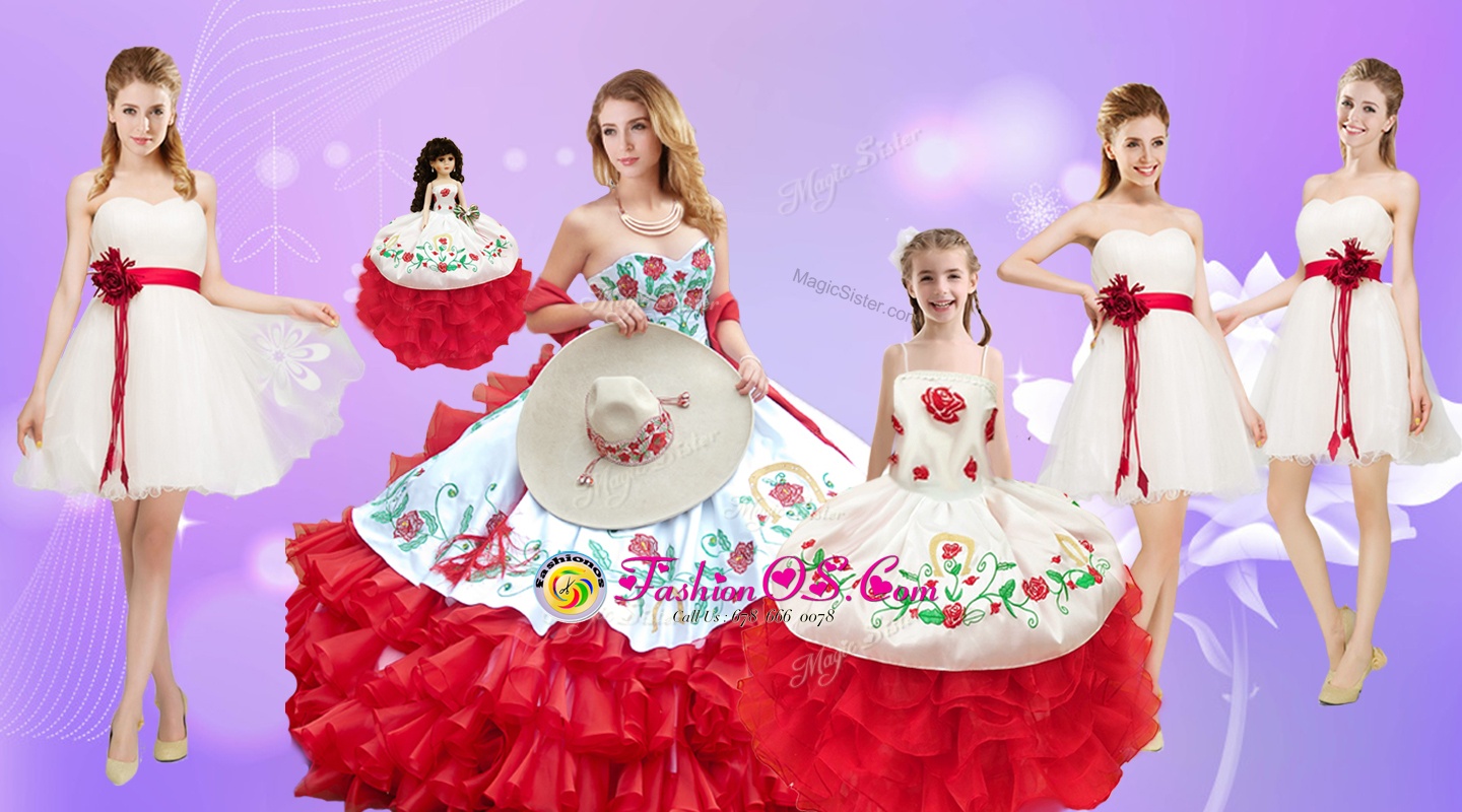 Home >  Quinceanera Dresses >  Quinceaneara Package > New Style White And Red Ball Gowns Beading and Ruffles Sweet 16 Dress Lace Up Organza Sleeveless Floor Length