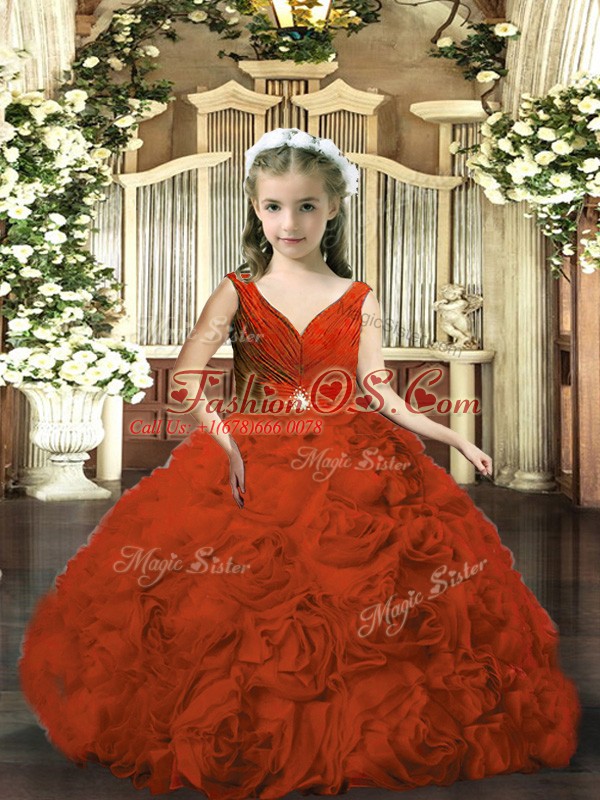 Nice Ball Gowns Girls Pageant Dresses Rust Red V-neck Fabric With Rolling Flowers Sleeveless Floor Length Backless