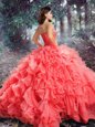Home >  Quinceanera Dresses >  Cute Quinceanera Dresses > Nice Coral Red Ball Gowns Strapless Sleeveless Organza Floor Length Lace Up Beading and Ruffles Quinceanera Dresses
