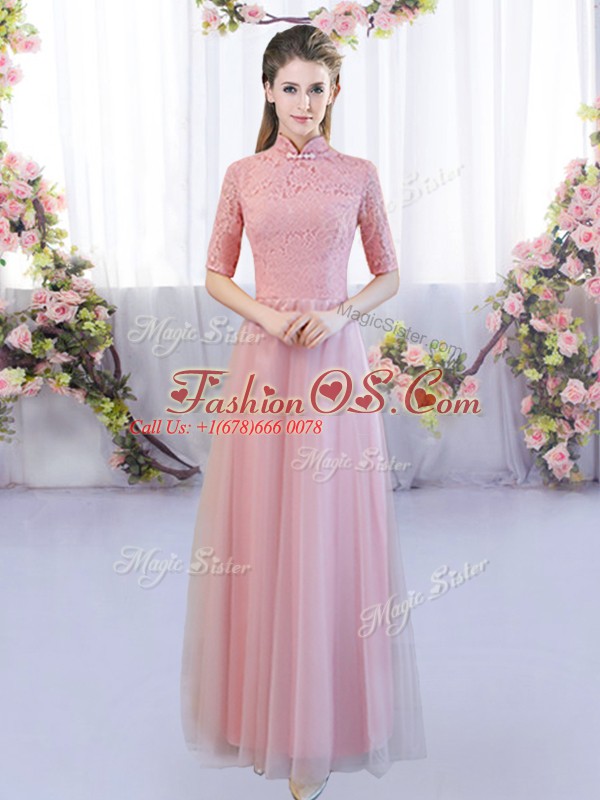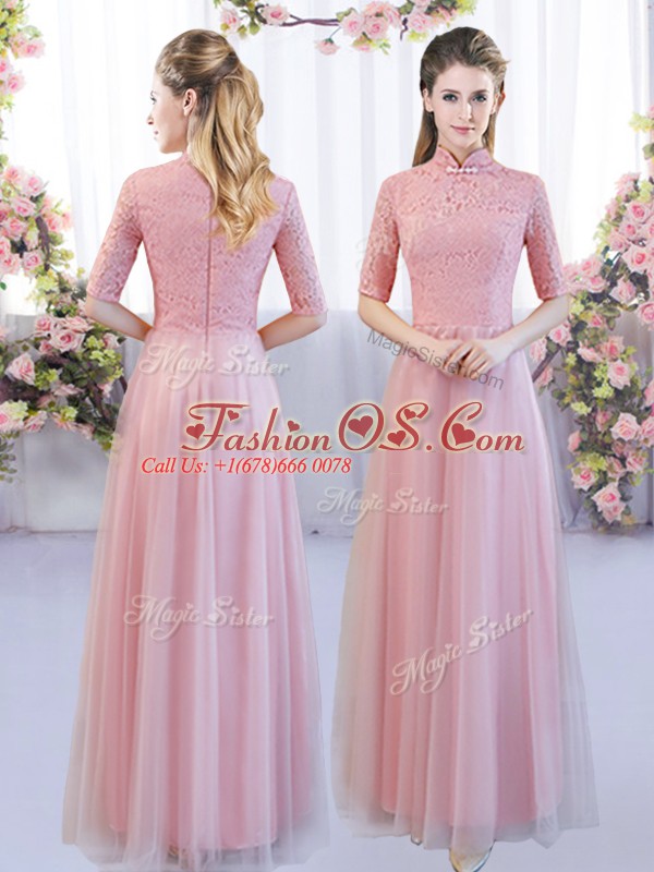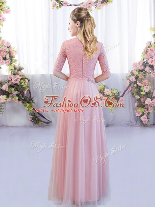 Nice Floor Length Pink Quinceanera Court Dresses High-neck Half Sleeves Zipper