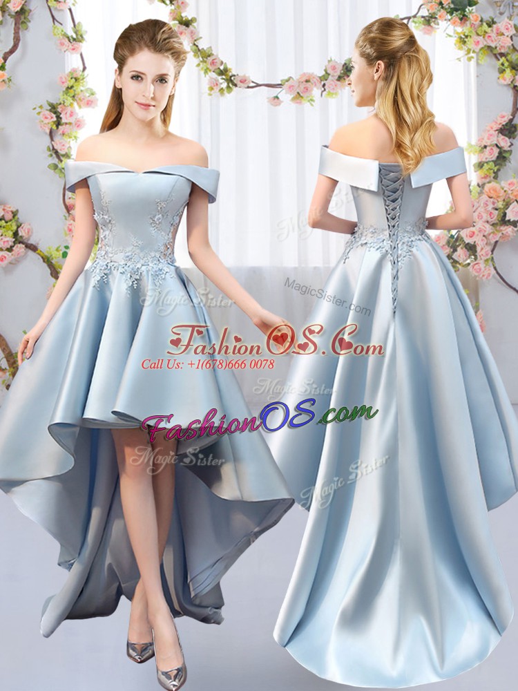 Nice High Low Light Blue Quinceanera Court Dresses Satin Sleeveless Appliques