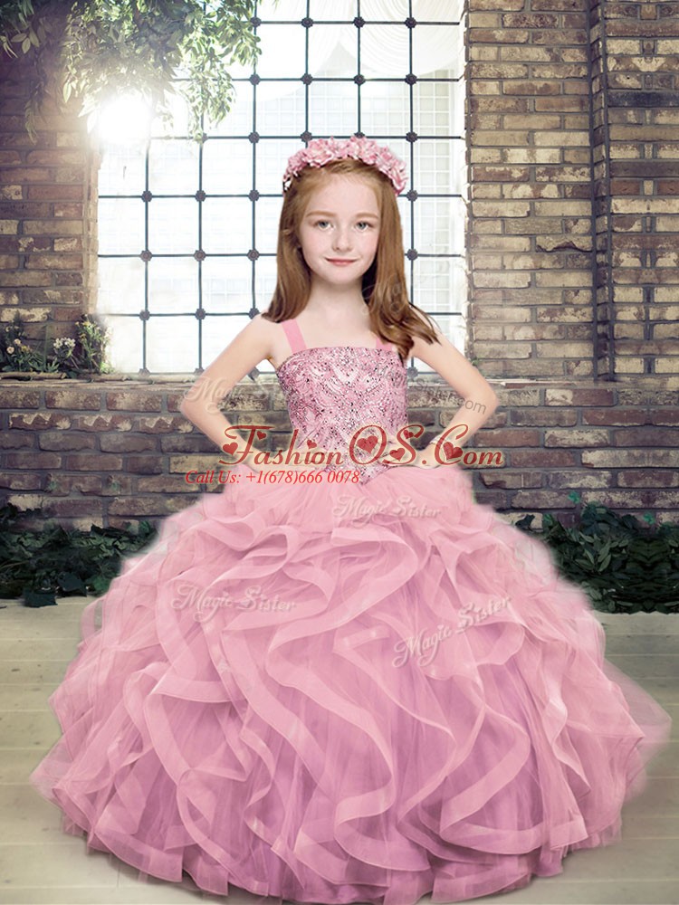 Nice Lilac Ball Gowns Straps Sleeveless Tulle Floor Length Lace Up Beading and Ruffles Pageant Dress for Teens