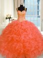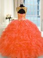 Nice Organza Straps Sleeveless Lace Up Embroidery and Ruffles Quinceanera Gowns in Orange Red