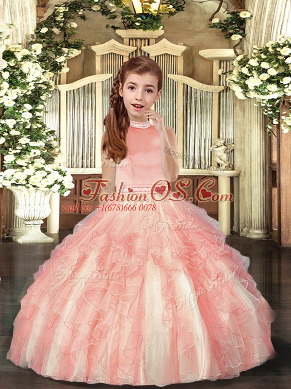Nice Peach Backless Kids Pageant Dress Beading and Ruffles Sleeveless Floor Length
