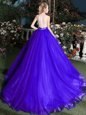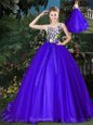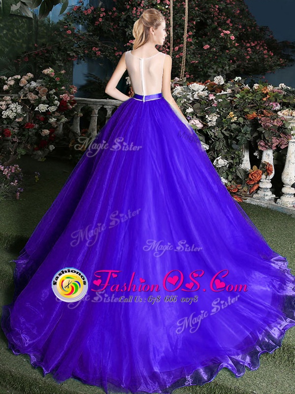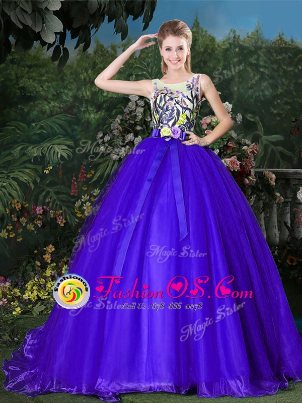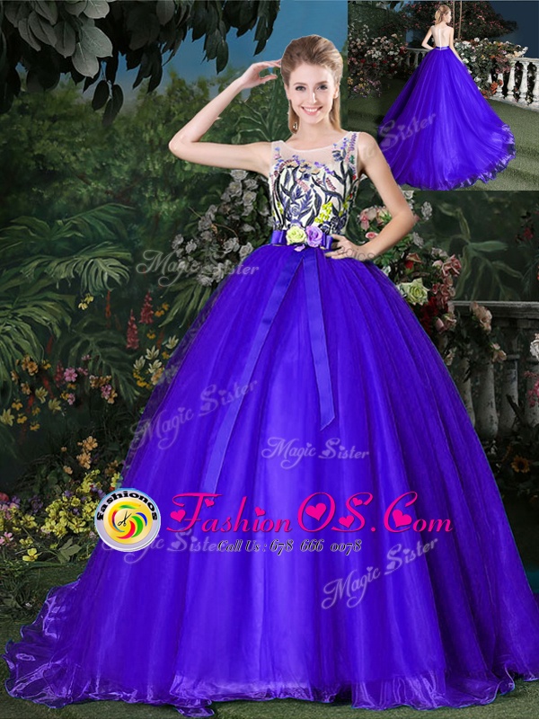 Nice Scoop Appliques and Belt Sweet 16 Dress Blue Zipper Sleeveless Brush Train
