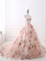 Nice Scoop Sleeveless Evening Party Dresses Brush Train Lace and Appliques and Belt Pink Organza and Printed