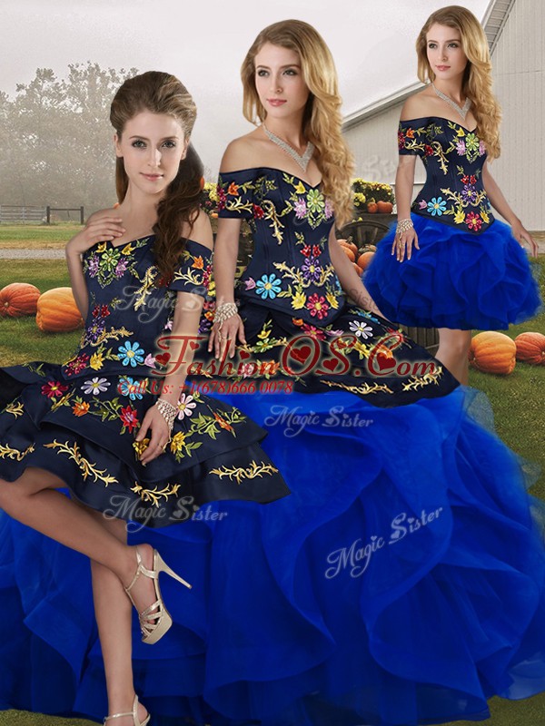 Home >  Quinceanera Dresses >  Detachable Quinceanera Skirts > Nice Sleeveless Tulle Floor Length Lace Up Ball Gown Prom Dress in Blue And Black with Embroidery and Ruffles