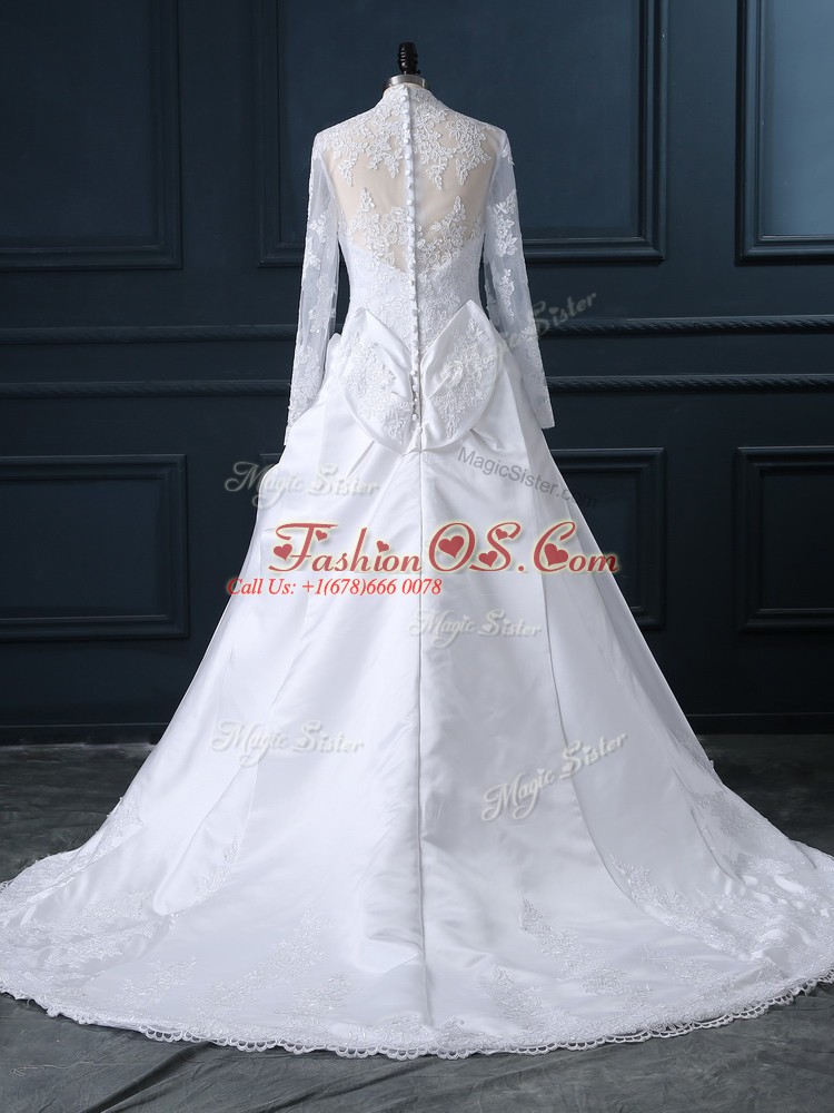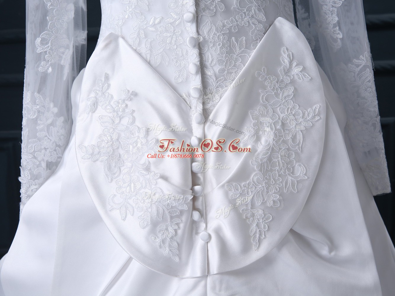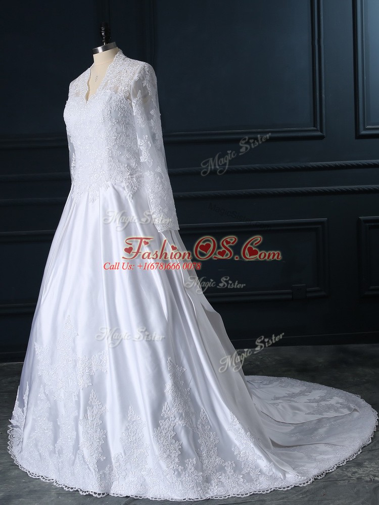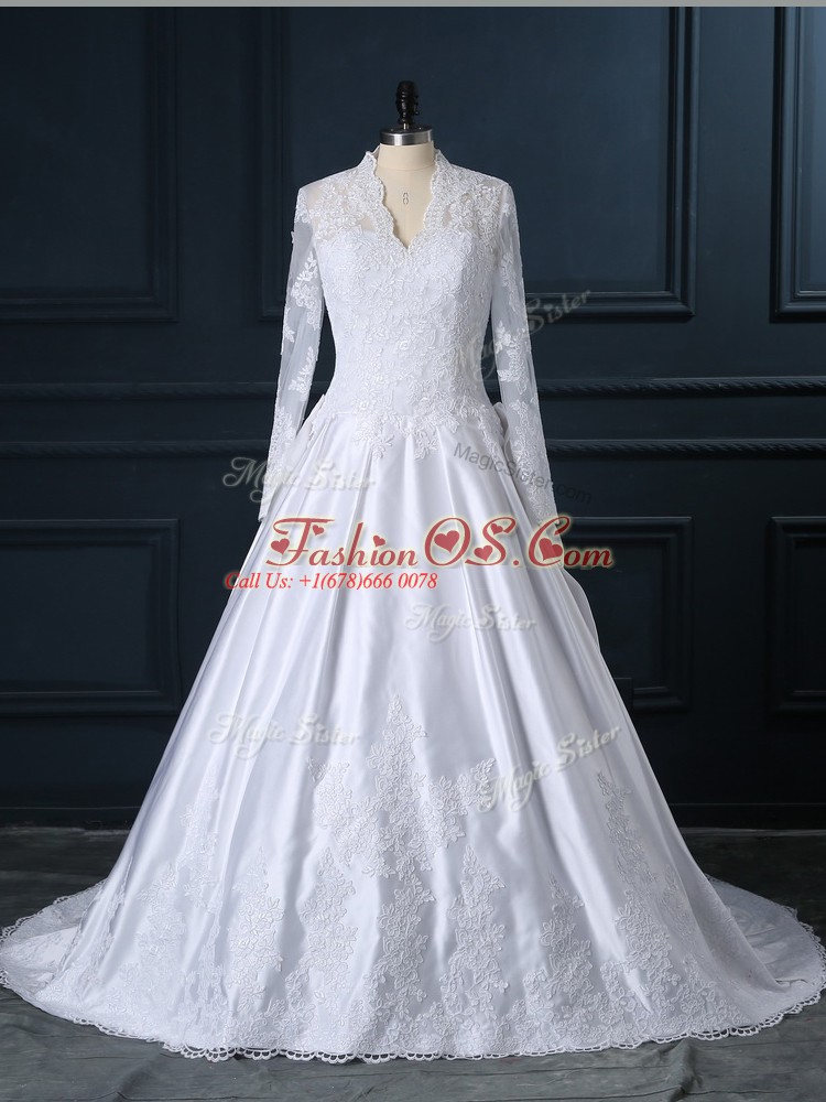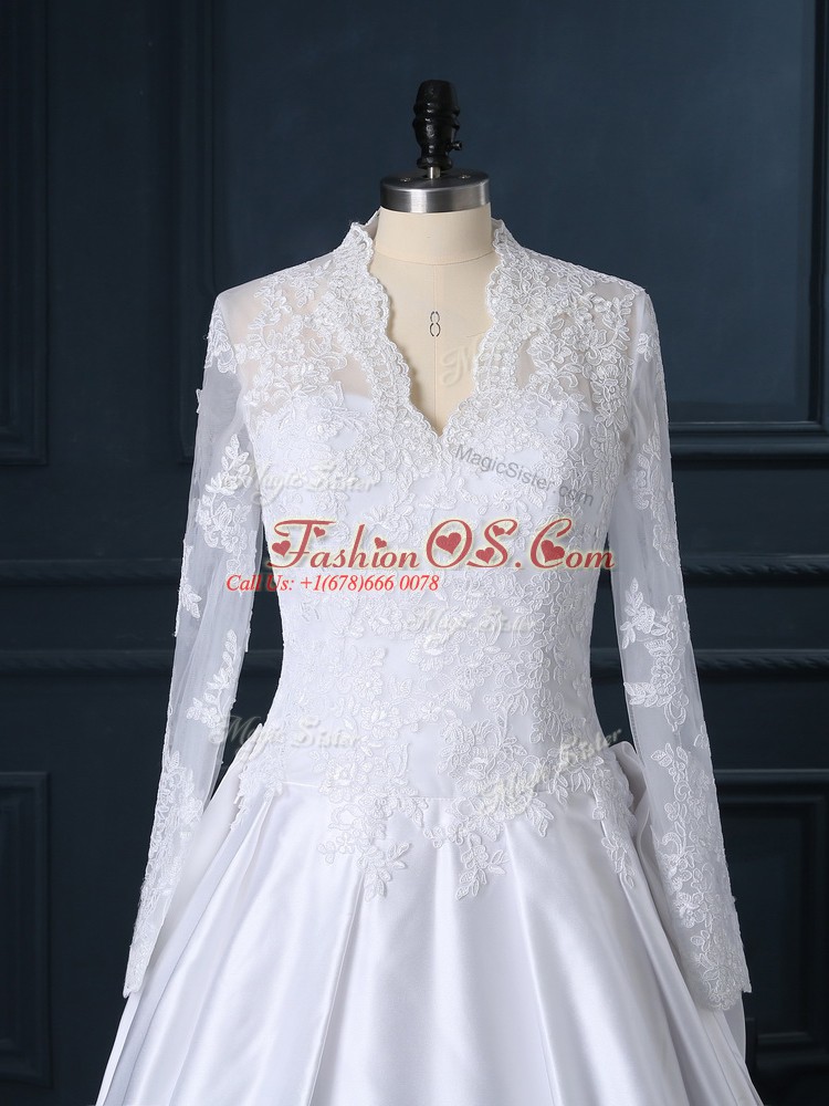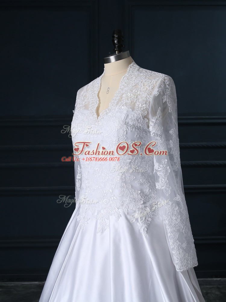 Nice Tulle V-neck Long Sleeves Brush Train Clasp Handle Lace Wedding Gowns in White