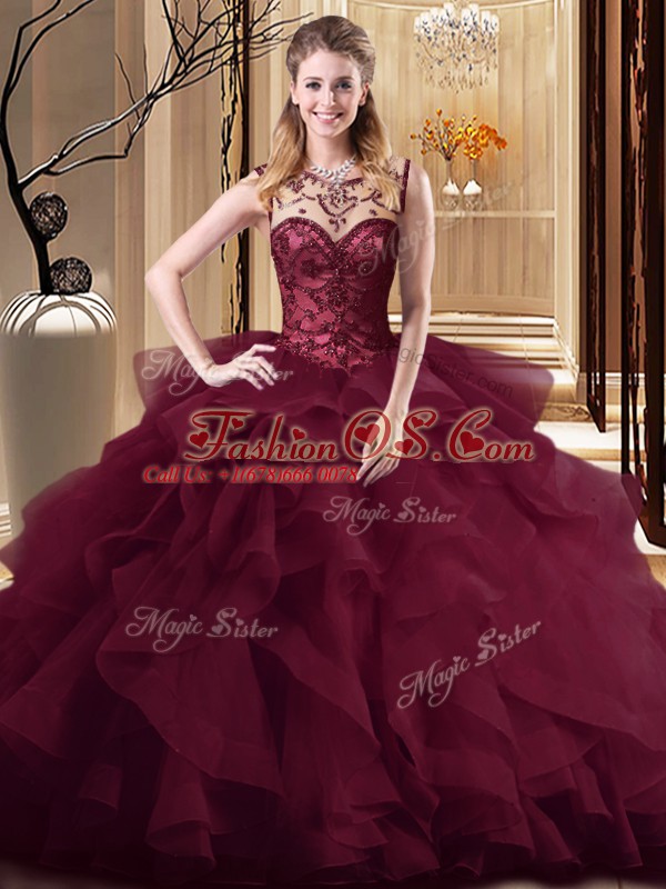 Home >  Quinceanera Dresses >  Quinceanera Dresses 2019 > Noble Burgundy Sleeveless Tulle Brush Train Lace Up 15th Birthday Dress for Military Ball and Sweet 16 and Quinceanera