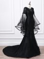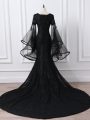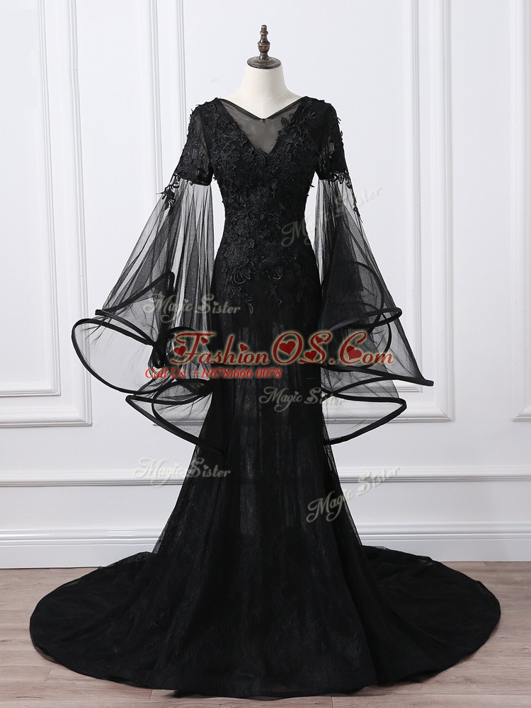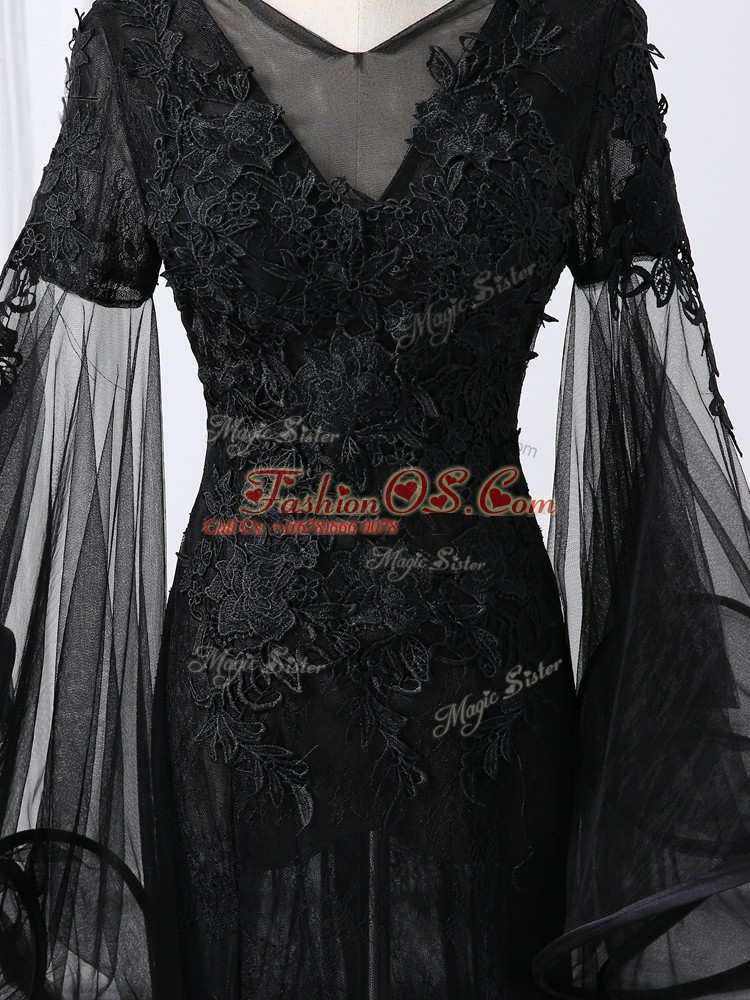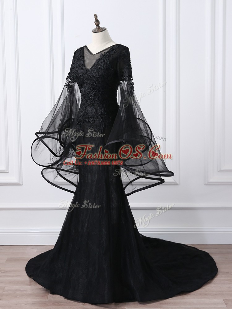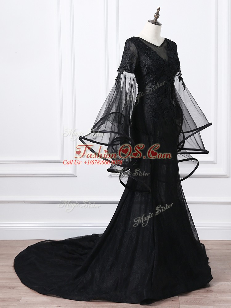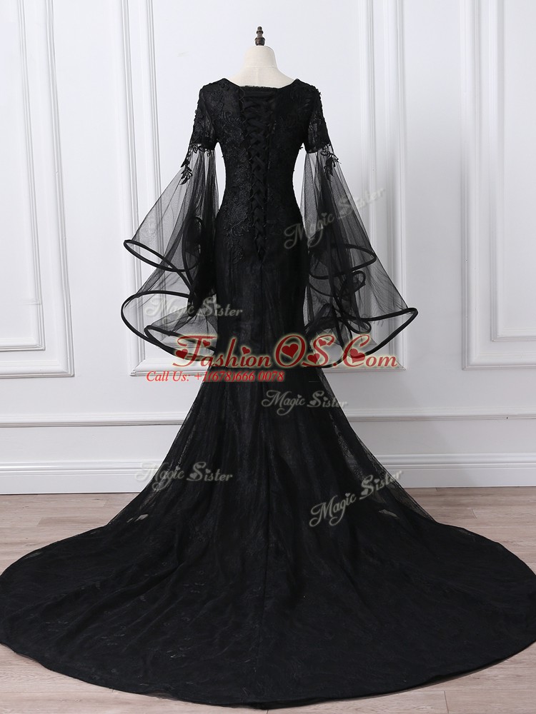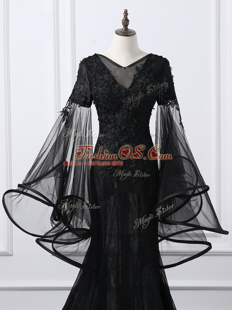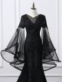 Noble Lace and Appliques Mother Of The Bride Dress Black Lace Up Long Sleeves Brush Train