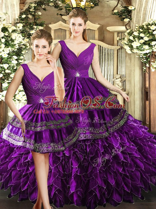 Home >  Quinceanera Dresses >  Detachable Quinceanera Skirts > Noble Purple Three Pieces Beading and Embroidery and Ruffles Quinceanera Gown Backless Organza Sleeveless Floor Length