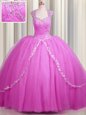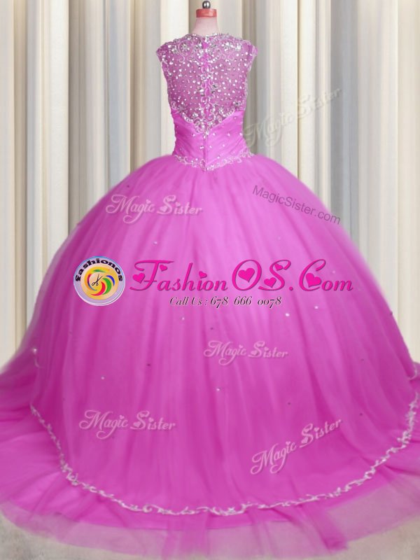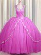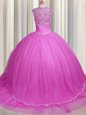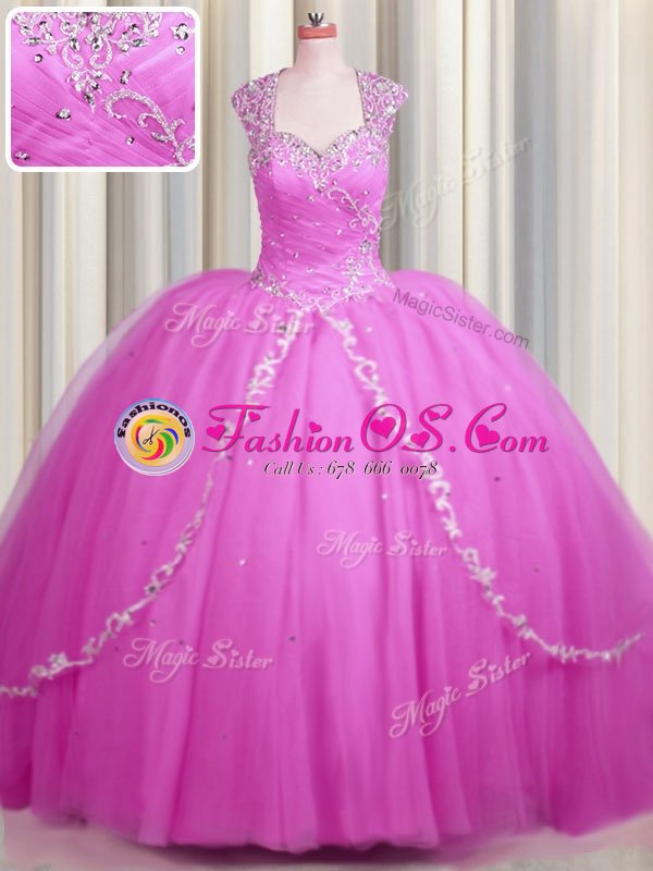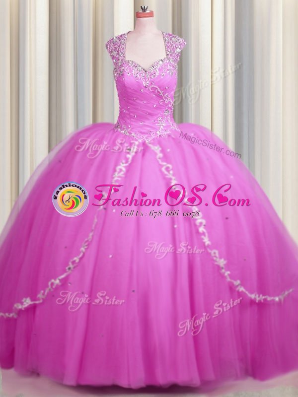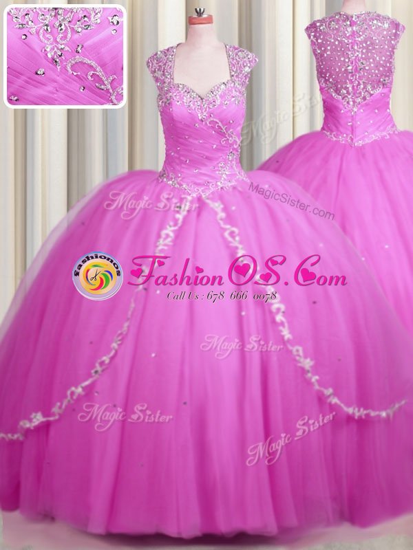 Home >  Quinceanera Dresses >  In Stock Quinceanera Dresses > Noble See Through Sweetheart Cap Sleeves Tulle Sweet 16 Quinceanera Dress Beading and Appliques Brush Train Zipper