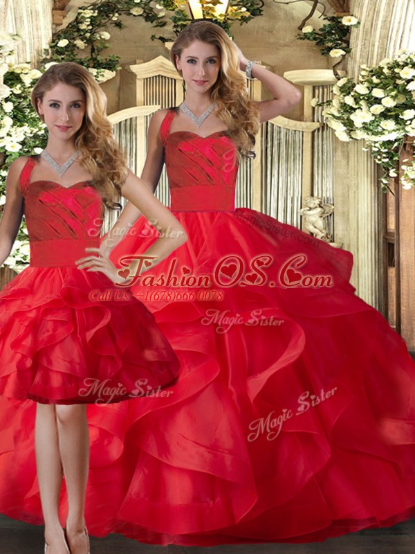Home >  Quinceanera Dresses >  Detachable Quinceanera Skirts > Noble Three Pieces Quinceanera Dress Red Halter Top Tulle Sleeveless Floor Length Lace Up