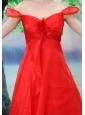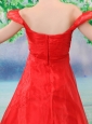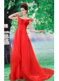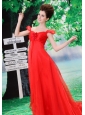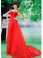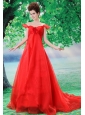 Off Shoulder Neckline Red A-line Organza Custom Made 2013 Prom Gowns With Court Train