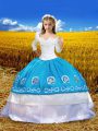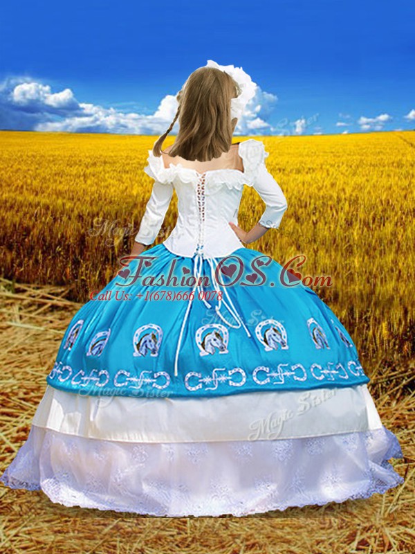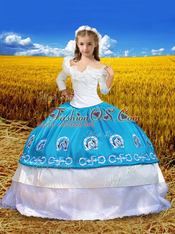 Off The Shoulder 3 4 Length Sleeve Little Girls Pageant Dress Floor Length Embroidery and Ruffles Blue And White Taffeta