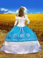 Home >  Special Occasion Dresses >  New Style Little Girl Pageant Dresses > Off The Shoulder 3 4 Length Sleeve Little Girls Pageant Dress Floor Length Embroidery and Ruffles Blue And White Taffeta