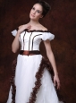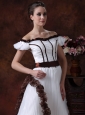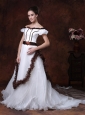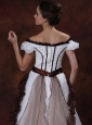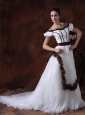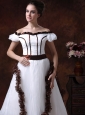Are you searching for a simple but elegant dress? This one is sure for your to own. This all white wedding dress with no luxurious beading on is a simple one. But when you see it, you will sure say"It is so beautiful". The comely dress features an off shoulder design with a scoop neckline. A close-fitting bodice which has a wide sash on the waist band that can fold a bow at one side as you like. The skirt is loose with a chapel trail. The special back style has sheath on it.