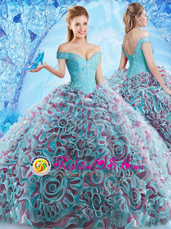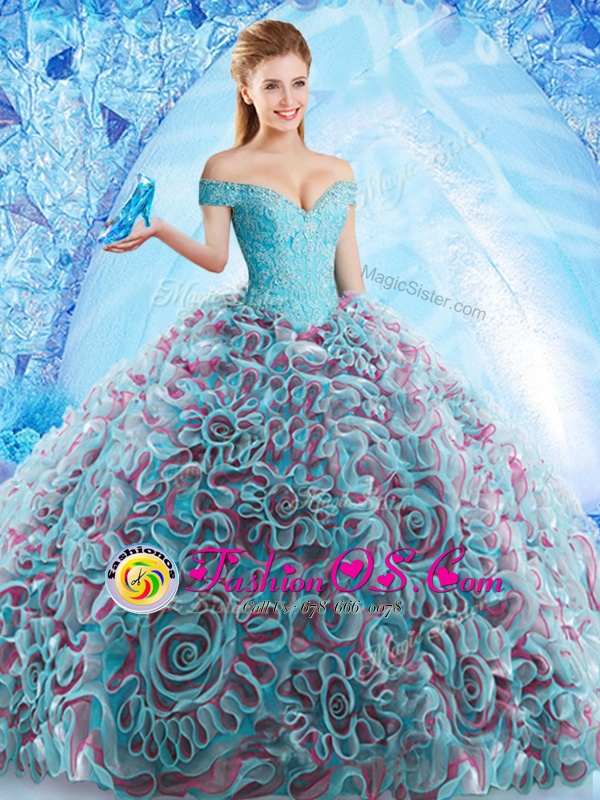 Home >  Quinceanera Dresses >  Cheap Quinceanera Dresses > Off the Shoulder Backless Multi-color Sleeveless Court Train Beading and Appliques and Ruffles Sweet 16 Dress