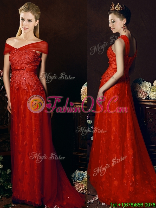 Off The Shoulder Belted and Laced Dama Dress with Brush Train