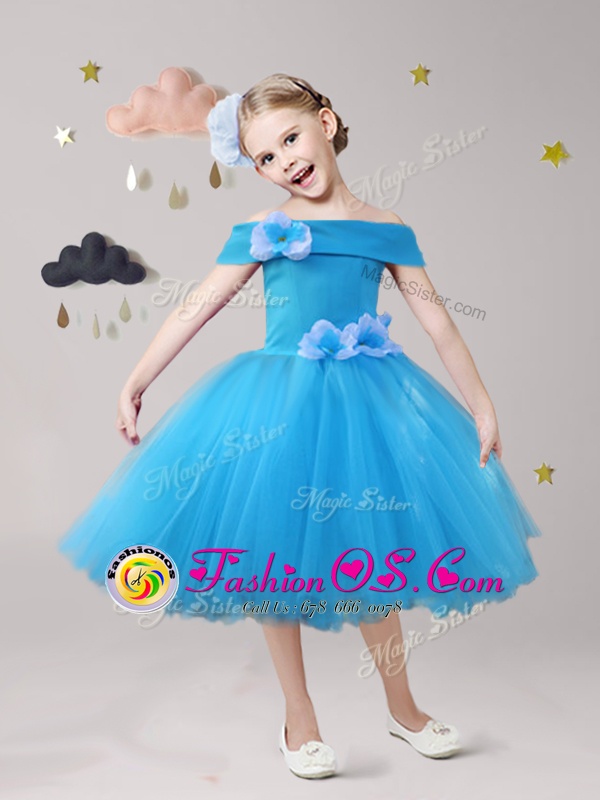 Off the Shoulder Blue Tulle Zipper Toddler Flower Girl Dress Short Sleeves Tea Length Hand Made Flower